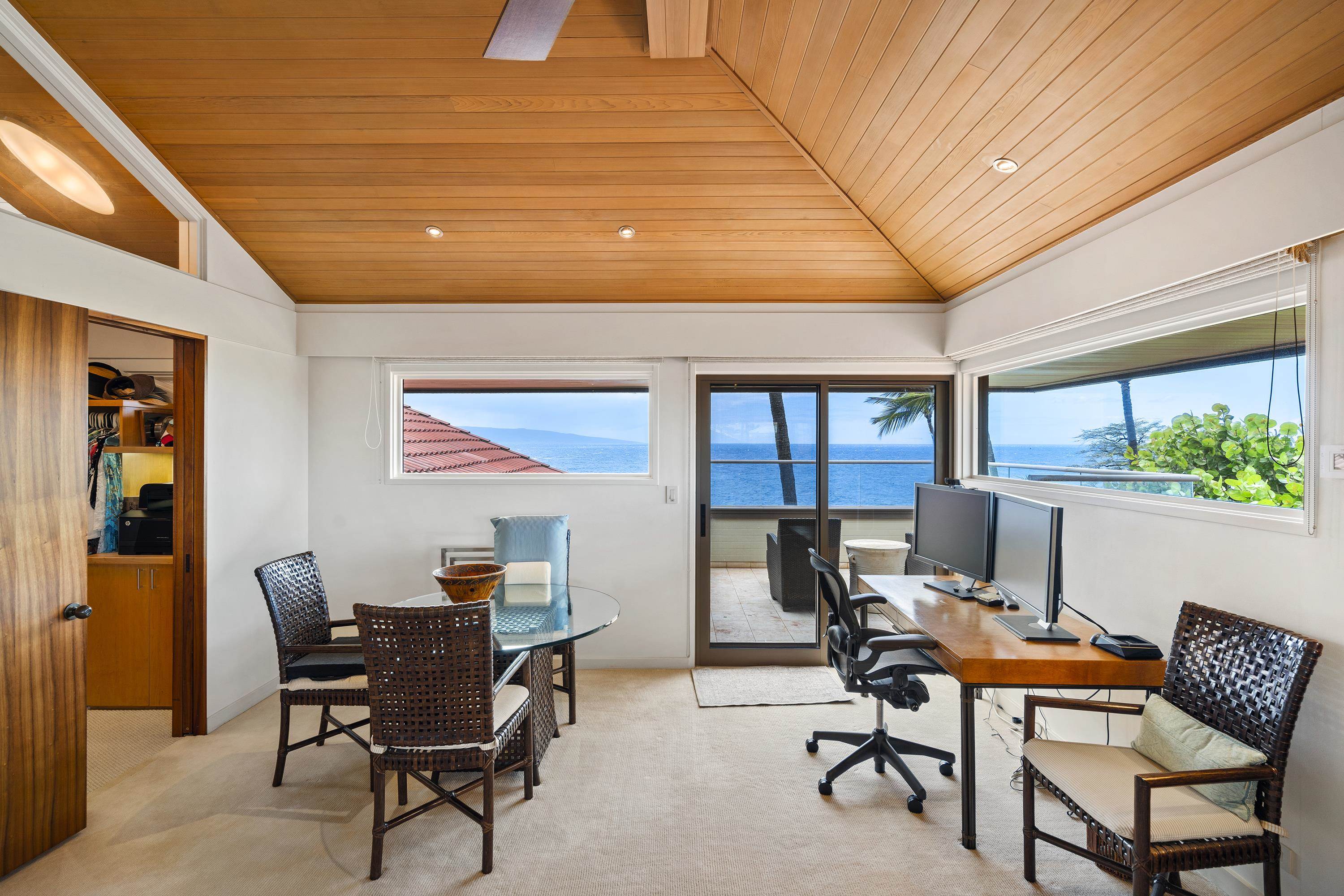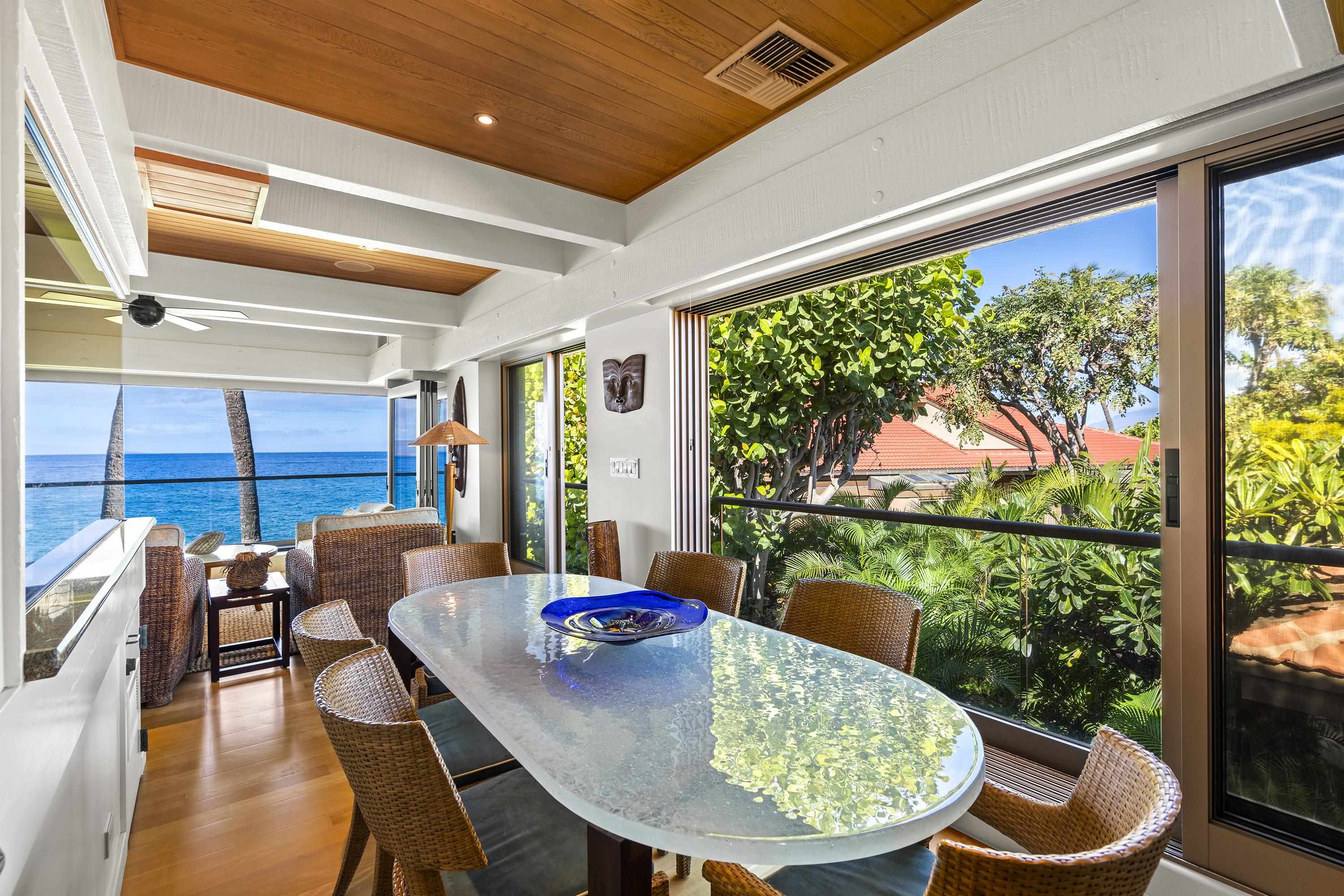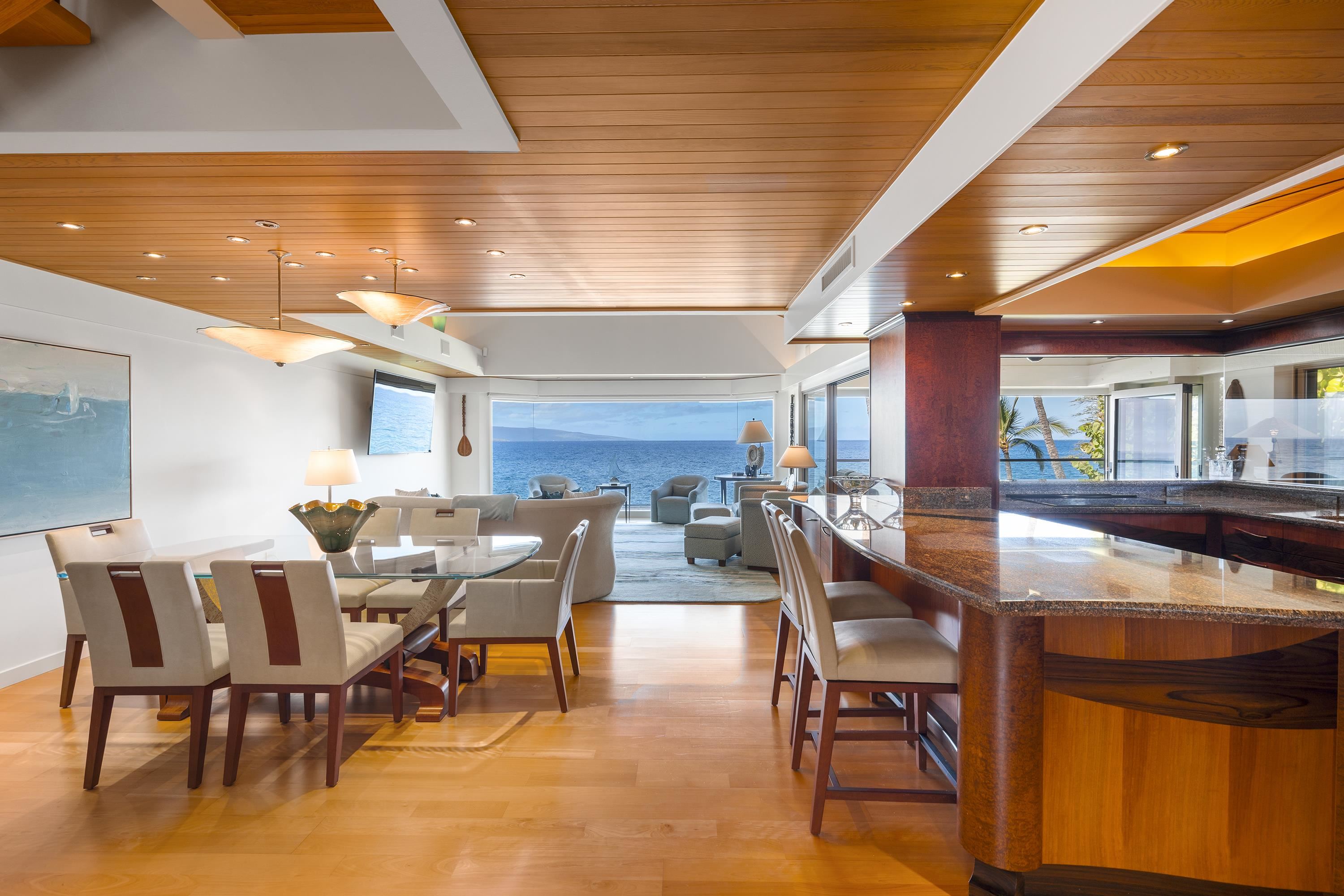 Positioned in the coveted front row of Wailea Point, Residence 502 sits just 75 feet from the surveyed shoreline, offering commanding southwest-facing views of Molokini Crater and the resort’s iconic blowhole. Given the slight elevation directly on the ocean, the home is perfectly situated for dramatic vistas and exceptional privacy from the oceanfront path below. The residence underwent a complete and elegant remodel in 2003, crafted with timeless design by interior designers Gretchen Schoch of Fairacres Studios and Cynthia Bengier, and brought to life by general contractor Dave Graham. At the heart of the home, a spacious open-concept kitchen captures breathtaking views and is appointed with granite countertops, custom wood cabinetry, a SubZero refrigerator, Thermador ovens, Décor range, Maytag washer and dryer, Wolf barbecue, and a Franke stainless steel sink with hot and cold filtered water, a soap dispenser, and Kitchenaide disposal. A reverse osmosis filtration system discreetly housed in a lanai cabinet supplies pristine water to the kitchen. Luxury furnishings of the highest quality are included, though most artwork is excluded. In 2019, new windows were installed throughout the residence, including a stunning mitered glass bay window in the main living area, amplifying the coastal light and breathtaking views. The expansive lanai is enclosed by a premium NanaWall system—effortless to operate and designed to blur the lines between indoor and outdoor living in one of the world’s most temperate climates. Wailea Point features exceptional quality construction; a very low density (just over 4 units per acre) garden environment; largely concrete low-rise buildings; 24-hour gated & roving security; two elaborate pool pavilions with 4 pools including a 2-lane, 25-meter lap pool, 2 whirlpool spas & full kitchens; lighted tennis court, 2 pickleball courts; superb fitness gym; barbeque areas; fruit & herb gardens; ample parking; fun, golf-cart friendly property. Beautifully landscaped and maintained, Wailea Point IS a beautiful garden. Enjoy the Four Season and Fairmont Kea Lani Hotels as immediate neighbors and all the 5-star services they offer. Furnishings included except art pieces.