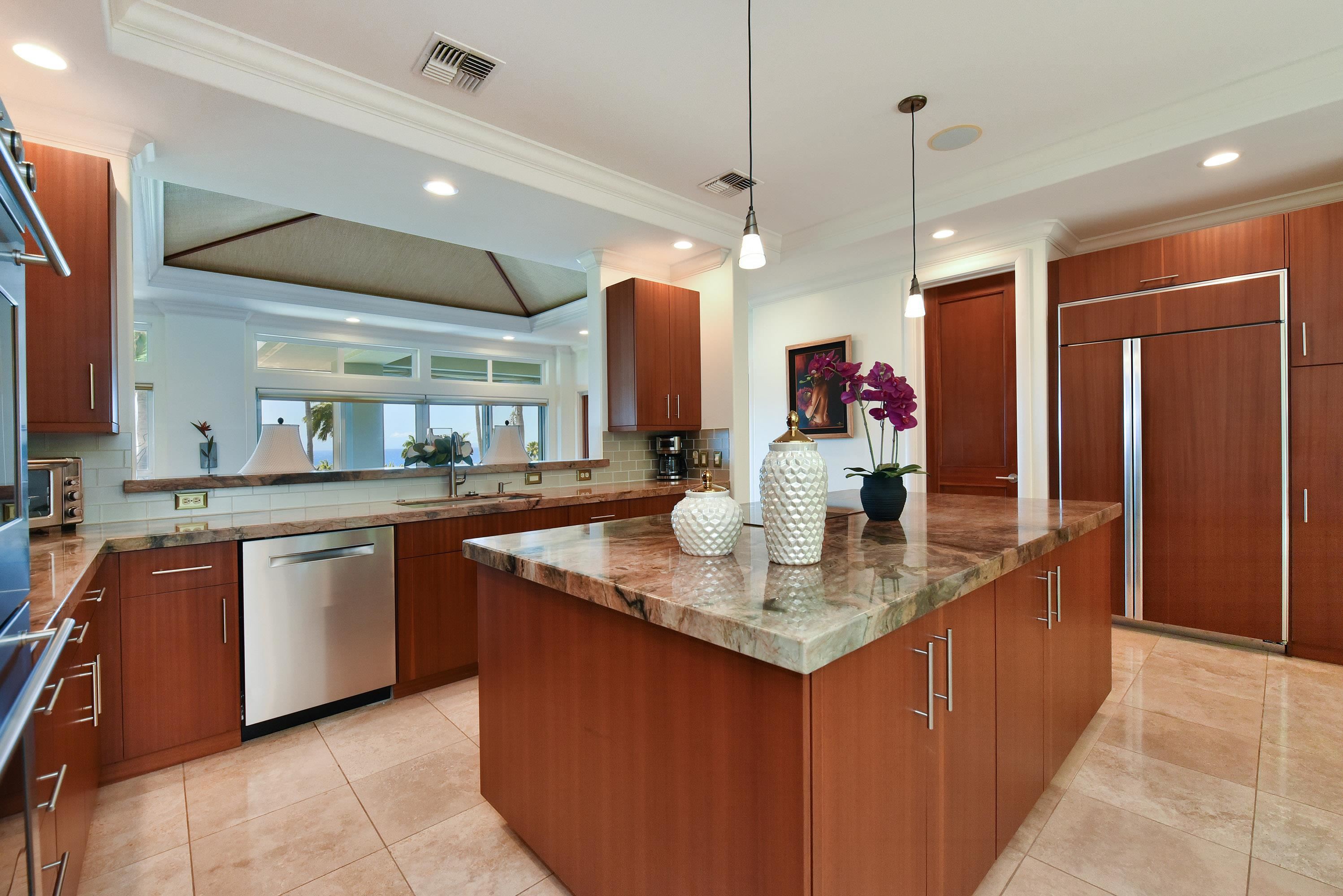 Classic one-story home in the Kaanapali Golf Estates designed by renowned architect, Ken O'Conner who built his reputation in California's wine country and has been commissioned to design homes in such prestigious communities as Sea Ranch in Mendocino and Kinney Brook Estates in the Napa Valley. The design O'Conner delivered is strikingly contemporary with fine quality craftsmanship while utilizing natural materials to ground the structure to its Hawaiian roots. Incredible ocean, island and sunset views. Home features upscale appliances and finishes throughout. The kitchen was completely remodeled in 2018 and has 5 burner glass ceramic cooktop, Sub Zero double door range and refrigerator & stacked ovens. Outdoor dining on the lanai accompanied by a pool area is perfect for outdoor barbecues and entertaining. Three full suites, plus a family/media room and a three-car garage. Six Array Enphase Solar installation with total of 81 - 285 Watt Solar Modules completed Jan 2018. Property is being sold AS-IS.